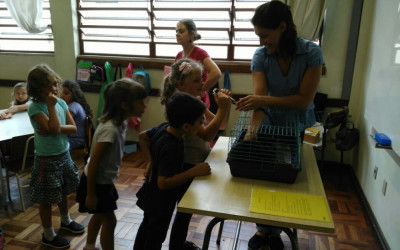 Com um estetoscópio, cada aluno pode chegar bem pertinho da Lola e ouvir seu coração, para que o colega ouvisse, era preciso que a turma fizesse silêncio e respeitasse o momento do amigo. Além de muito comportada, a coelha Lola ganhou muito carinho.