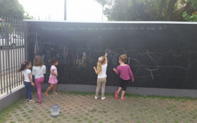 Ivoti – As alunas do Nível 3 B e a professora Daiane Rohr da Rosa estão desenvolvendo um projeto em comemoração aos 500 anos da Reforma Luterana intitulado “A descoberta de Lutero”. Elas pesquisaram e descobriram que inicialmente Lutero tinha medo de Deus, então pensaram sobre os seus próprios medos e pintaram em diferentes superfícies: bruxa, formiga, minhoca, aranha, beleléu, zumbi, caveira, entre outros. Depois os medos pintados na parede de azulejos e no quadro negro foram apagados simbolicamente com um pano, mostrando a superação desse medo e o desaparecimento dele.