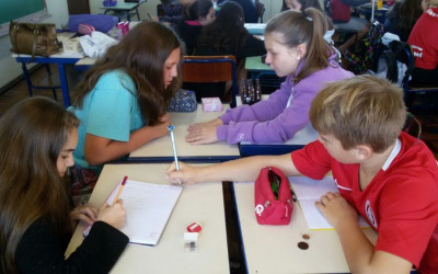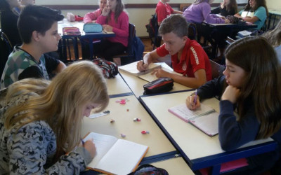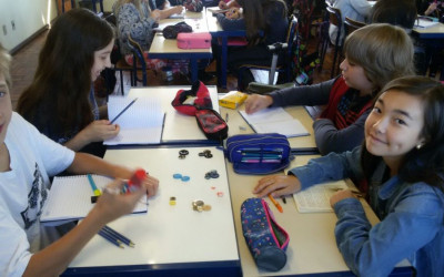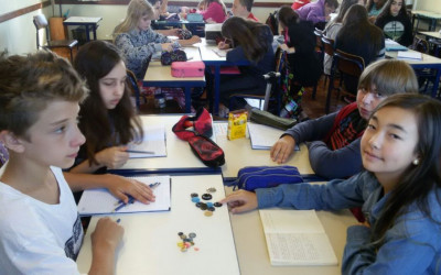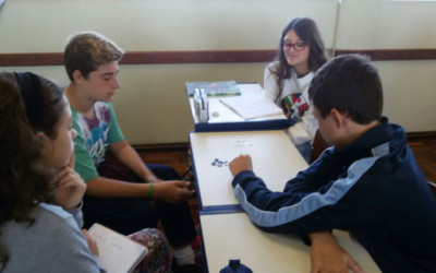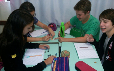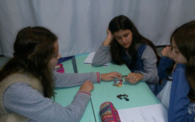 A atividade consistia em separar os botões em grupos e a partir desse primeiro grupo fazer novos subgrupos gerando outros dois, quatro e por fim, oito. Em cada separação os alunos precisavam definir o critério utilizado, não poderia ser uma separação aleatória.