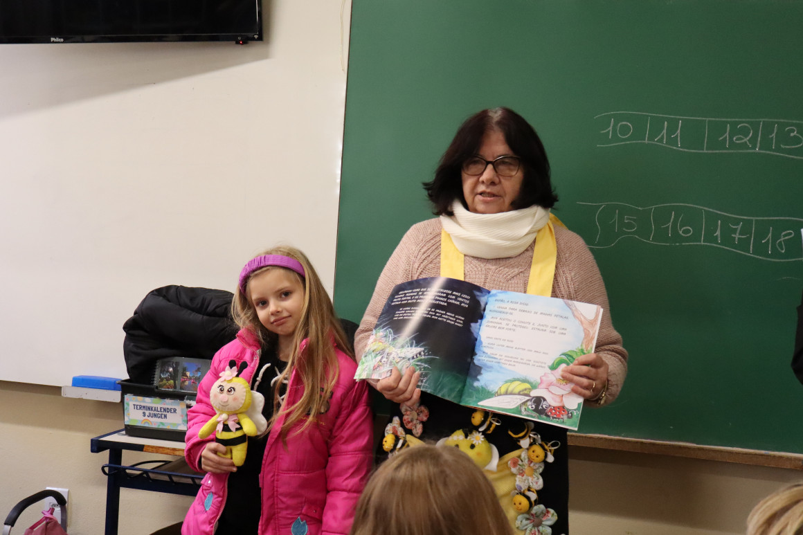 Na terça-feira a turma do nível 5 da educação infantil e a turma do 1 ano participaram de um momento de contação de história, do livro “Mya, a abelha serelepe” com a escritora Leani Koppe.