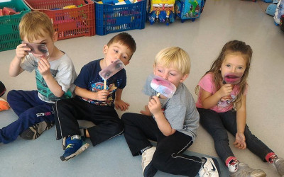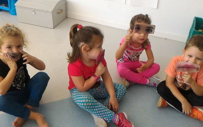 Uma das atividades desenvolvidas foi através de fotos dos olhos e da boca de cada alunos. As fotos foram recortadas e cada aluno precisou identificar qual era o seu. Depois, o material utilizado foi organizado pela professora Bruna Hoffmann em uma exposição interativa e, o desafio dos pais é de identificar os olhos e a boca dos seus filhos.