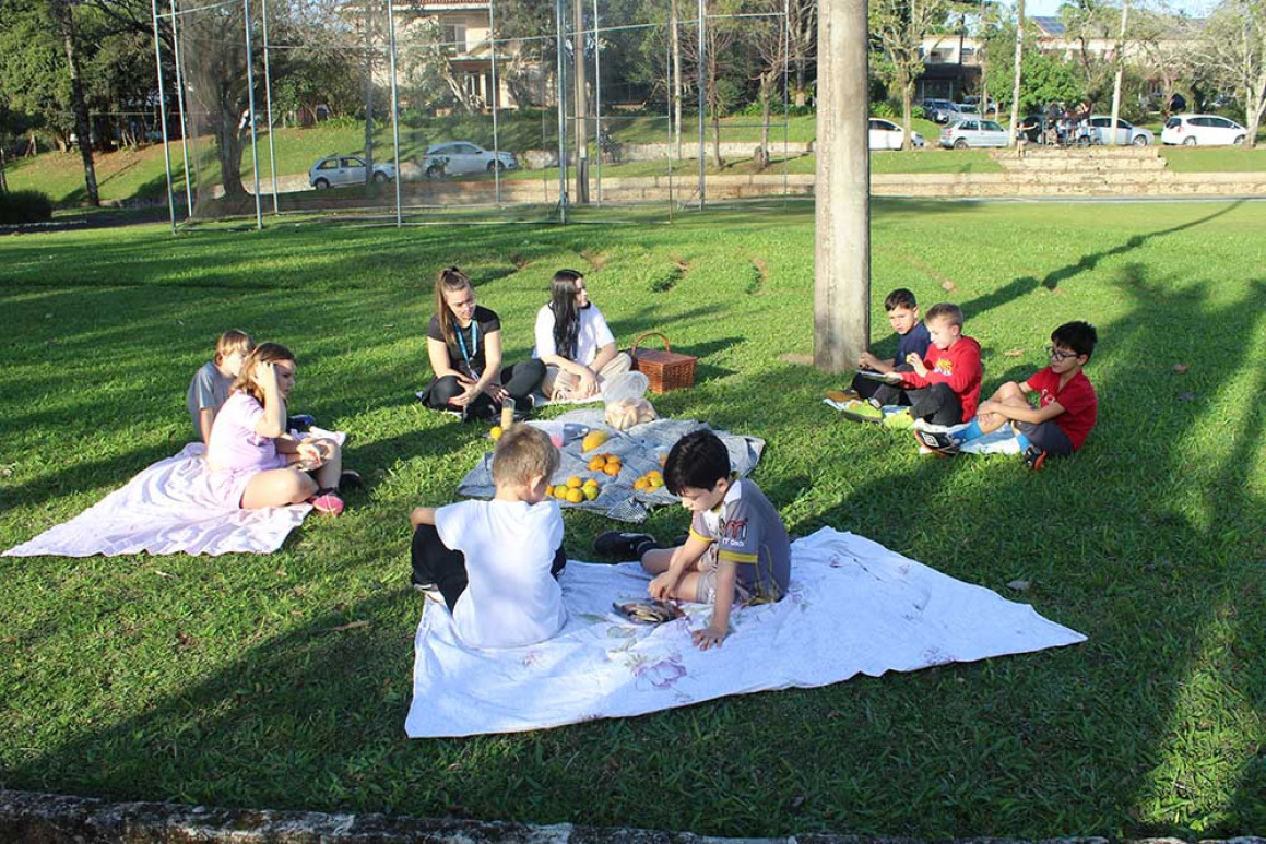 As crianças do 1º ao 4º ano que estão no Turno Integral participaram de um piquenique de frutas na manhã de quinta-feira, 13. A ideia da atividade foi de disponibilizar uma variedade de frutas com os alunos e conversar sobre os motivos que fizeram eles escolherem as frutas que trouxeram.