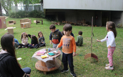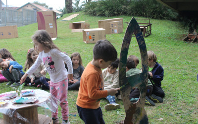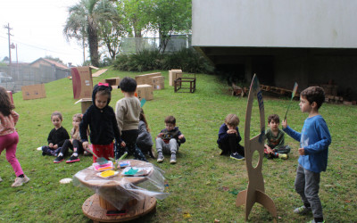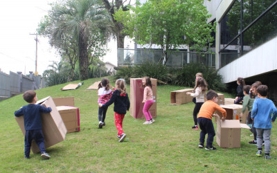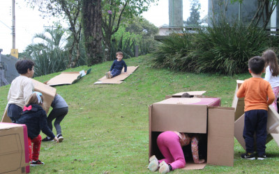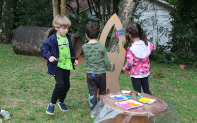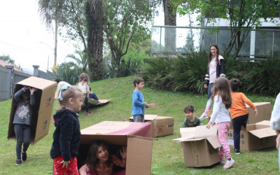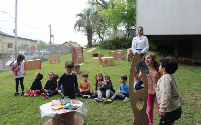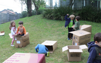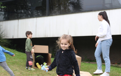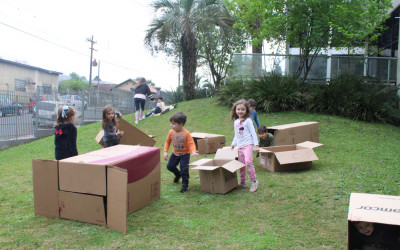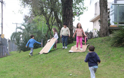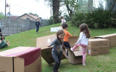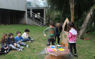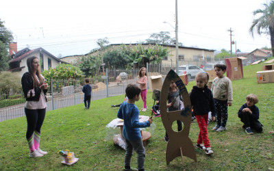 Utilizando mata-moscas e tintas, as crianças pintaram um foguete e depois, usando caixas de papelão, brincaram de chegar ao céu descendo o morro de grama na área externa da Educação Infantil do Instituto Ivoti.