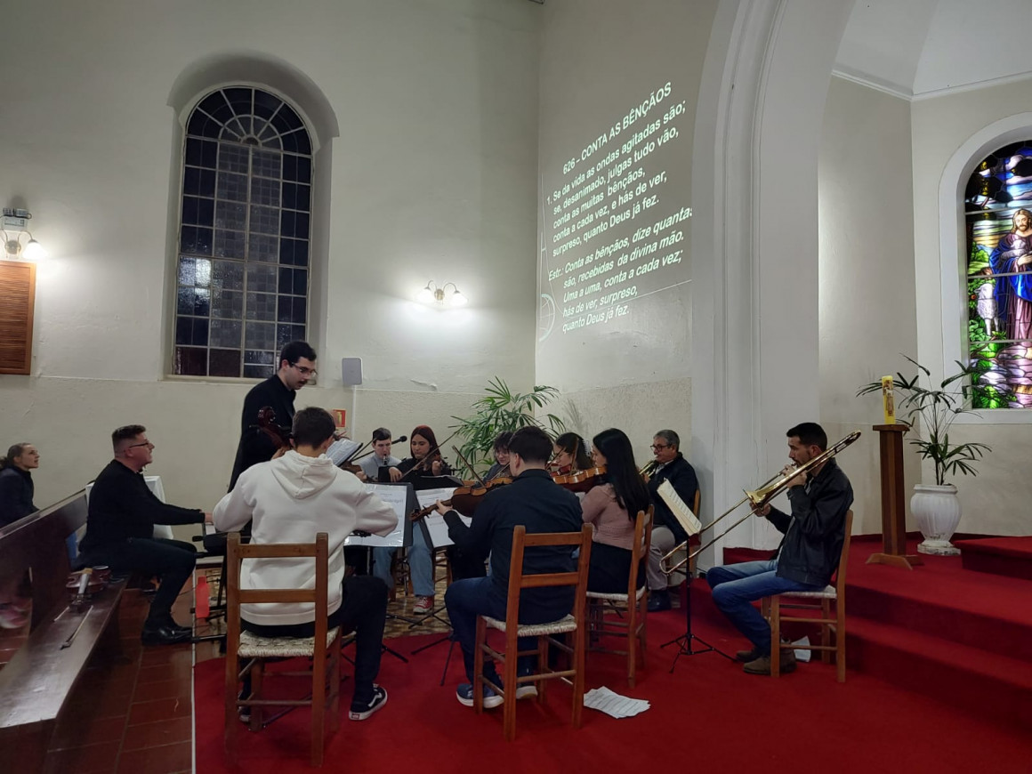 O encerramento da atividade ocorreu à noite, na Comunidade Evangélica Luterana de Dois Irmãos, durante um culto comunitário. Na ocasião, os estudantes assumiram a regência do grupo instrumental, vivenciando uma experiência significativa de atuação musical em um contexto religioso.