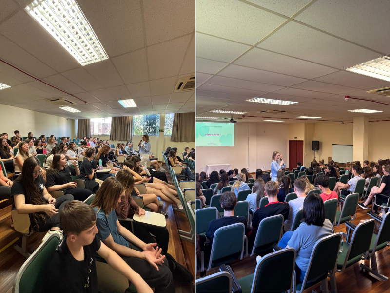 Durante a conversa, os alunos puderam conhecer mais sobre o funcionamento do intercâmbio, os requisitos necessários e as etapas do processo de inscrição. Josiane também apresentou uma agência parceira que auxilia no encaminhamento e acompanhamento dos jovens interessados, esclarecendo dúvidas e orientando sobre a preparação para essa experiência internacional.