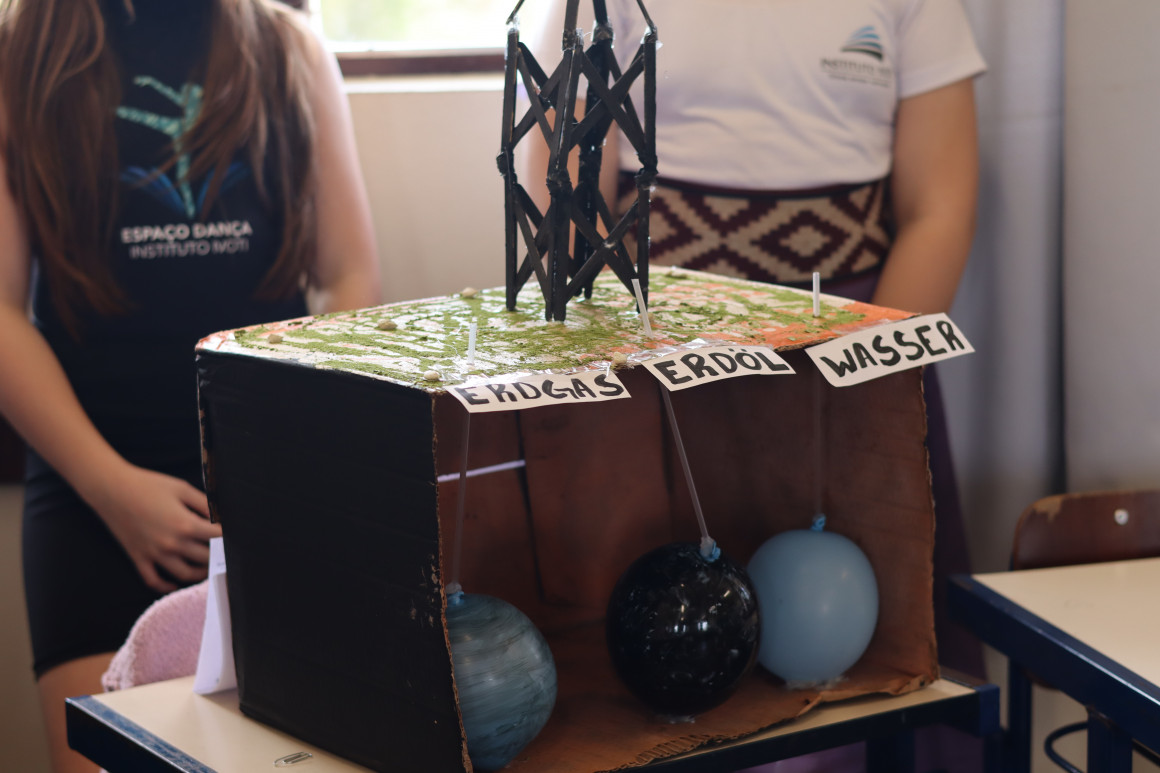 Cada grupo escolheu uma fonte de energia, estudou seu funcionamento e construiu uma representação criativa que mostrava como ocorre a produção e o uso dessa energia no dia a dia. Durante as apresentações, que foram feitas na língua alemã, os estudantes compartilharam não apenas os aspectos técnicos, mas também os benefícios e as desvantagens de cada alternativa, estimulando a reflexão sobre escolhas conscientes para o presente e o futuro.