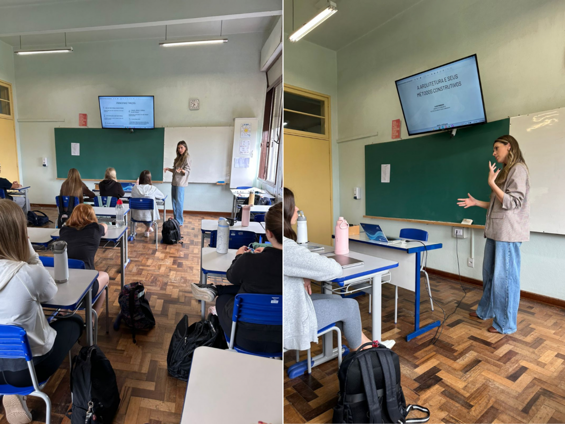 Durante a apresentação, Alana compartilhou com os estudantes as principais tendências da construção moderna, destacando características e soluções que têm transformado o setor. Além de apresentar conceitos atualizados, a convidada também trouxe aspectos de sua trajetória profissional, enriquecendo a conversa com exemplos reais e reflexões sobre o dia a dia na área.