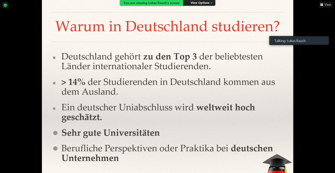 Primeiramente, foi feita uma apresentação explicando quais as vantagens de ingressar em um Studienkolleg. Representantes dos Studienkollegs de Heildelberg e Dresden apresentaram quais são os requisitos de ingresso e quais cursos são oferecidos. Além disso, mostraram um pouco sobre a vida nessas cidades. “Foi uma oportunidade significativa aos estudantes, que puderam compreender melhor este sistema, o que vai ajudar nas suas escolhas futuras de estudo e trabalho na Alemanha”, destacou a professora Jaqueline Schabarum.