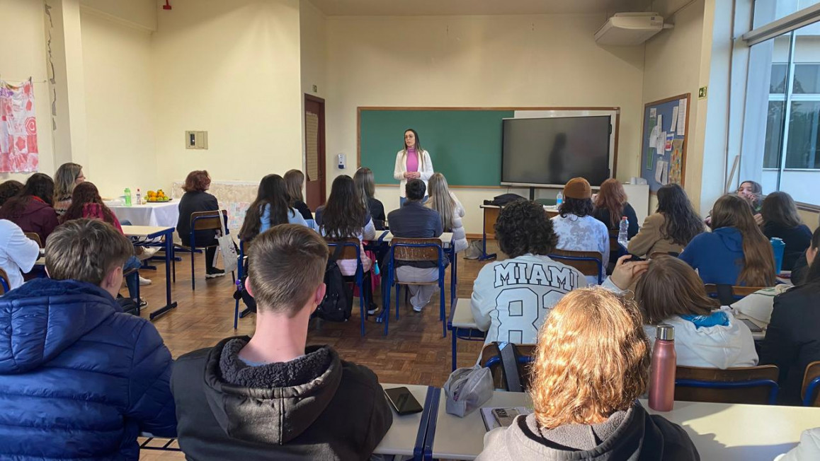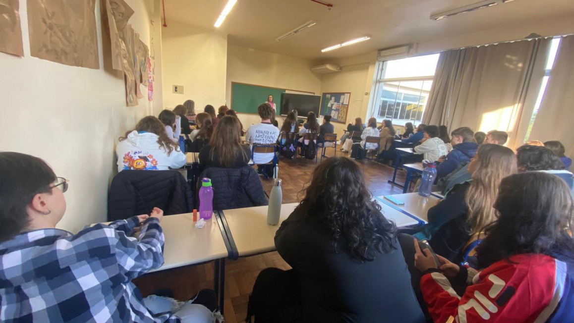 Estudantes do 3º ano, na disciplina de Mercado e Profissionalização e do 2º ano, na disciplina de Comunicação Visual I do Itinerário Formativo em Formação Técnica e Profissional - Técnico em Design Gráfico receberam a designer, egressa do Instituto Ivoti, formada em 2010, Kamila Câmara, para falar sobre sua vivência na área.