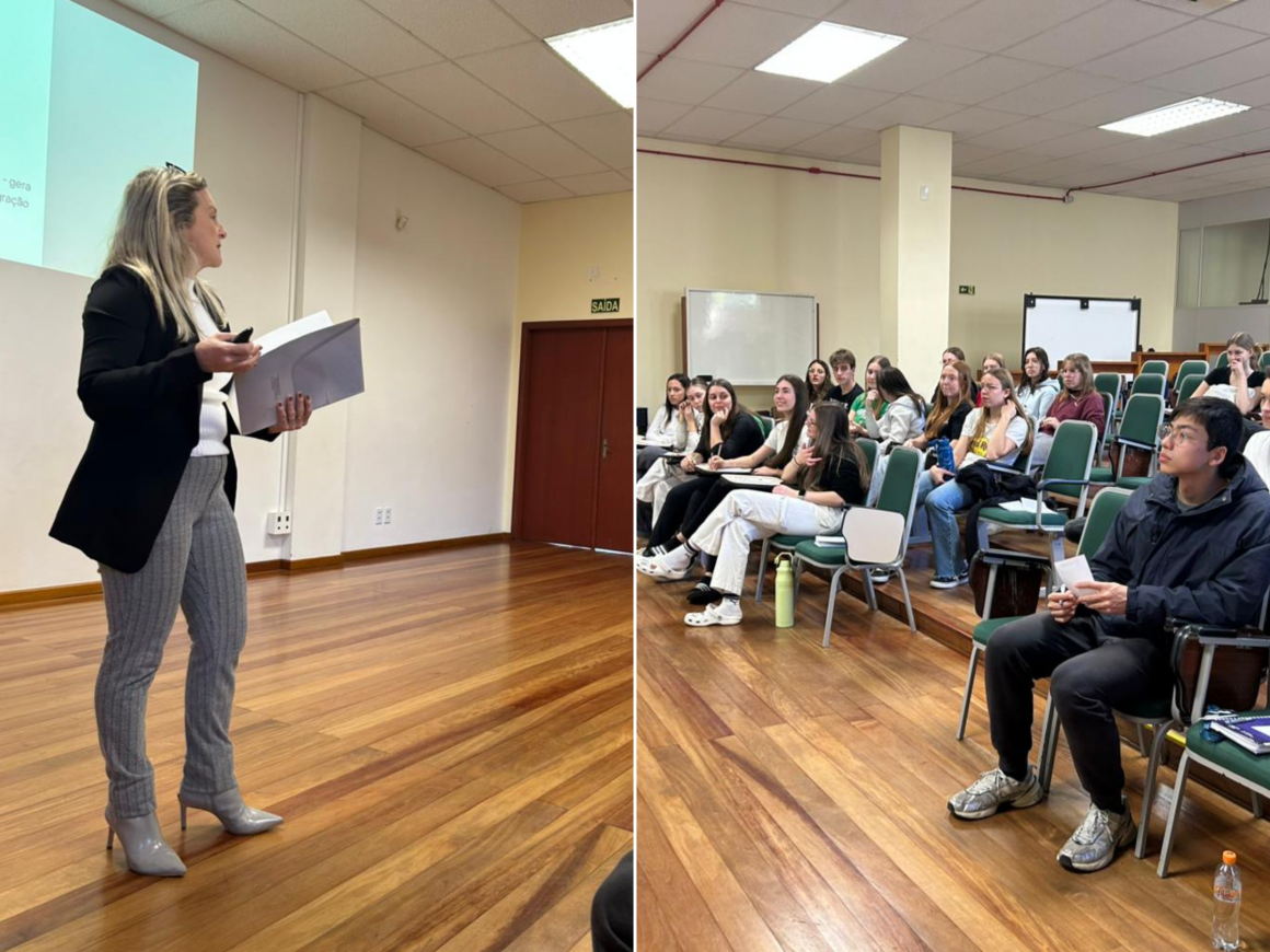 A convidada compartilhou orientações sobre temas importantes para quem está iniciando a vida profissional, como primeiro emprego, folha de pagamento, deduções e imposto de renda de pessoa física. A atividade foi promovida pelo componente Estatística Fazendo Sentido, que busca aproximar os conteúdos de sala de aula da realidade dos jovens.