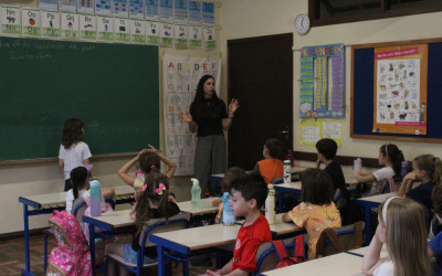 Nutricionista Roberta realiza visita na turma do 1º ano B para conversar sobre alimentação