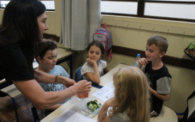A nutricionista contou para a turma uma história sobre a importância de comer frutas e perguntou se elas sabiam quantas frutas deveriam ser consumidas por dia. Na sequência, em grupos, as crianças brincaram com um jogo de tabuleiro e, dependendo da casa em que caiam, precisavam realizar ações como: comer uma salada, uma fruta, uma proteína ou um carboidrato. O desafio era ter coragem para comer o alimento, mesmo que fosse apenas um pedacinho.