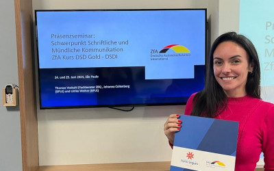 Indiara e Ulrike fizeram o DSD I Gold, realizado em São Paulo. Débora e Cristiane estavam no Rio de Janeiro participando do DSD II Gold. O objetivo principal do DSD Gold é preparar os professores para a aplicação das provas de Deutsches Sprachdiplom (DSD). Além de aprofundar os conhecimentos sobre o funcionamento das provas, eles estudam sobre as quatro habilidades avaliadas, ler, ouvir, escrever e falar, conhecem novos materiais disponíveis e estratégias para a aplicação das provas.