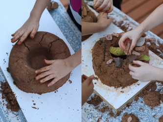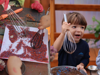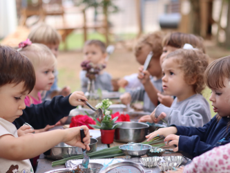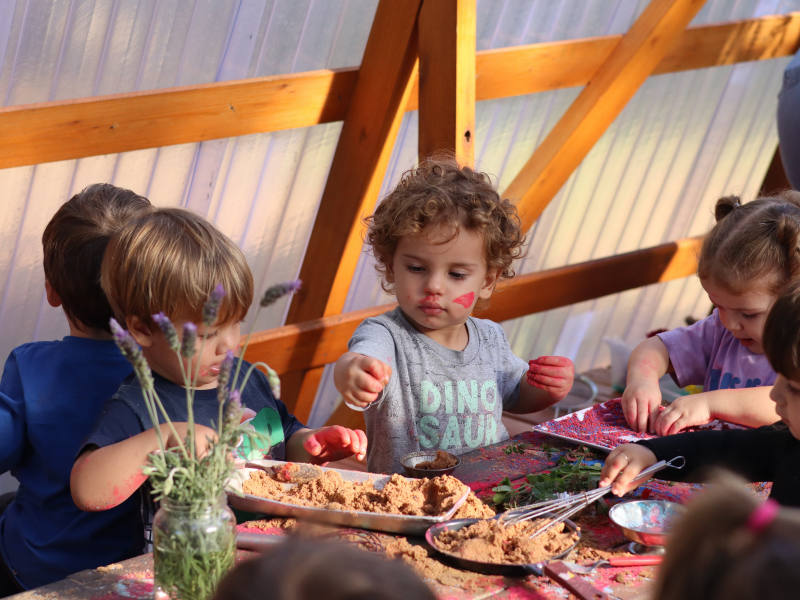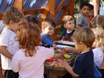 As comemorações também envolveram experiências lúdicas, como a proposta realizada com as turmas do Nível 2 e Gruppe 5, que foram convidadas a criar e decorar bolos de areia. A atividade, pensada de forma cuidadosa, estimulou a imaginação, a criatividade e o envolvimento das crianças. Durante a vivência, foram observadas aprendizagens importantes, como a exploração de diferentes texturas, o desenvolvimento da coordenação motora, a interação entre os colegas e a construção de narrativas simbólicas.