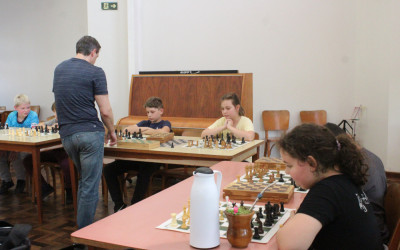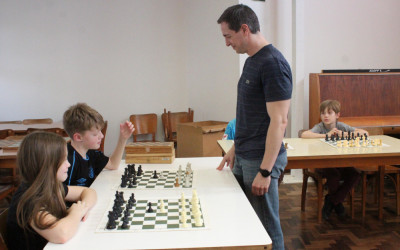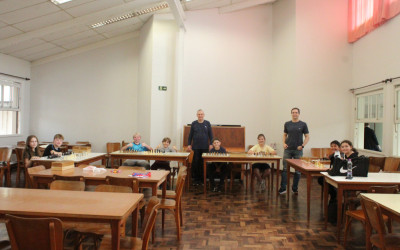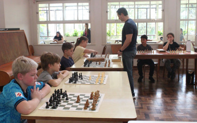 Estudantes que participam dos cursos complementares na modalidade de xadrez participaram de uma atividade diferente. O professor Romar Schneider convidou o enxadrista Luciano Enzweiler para desafiar a turma.