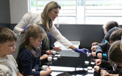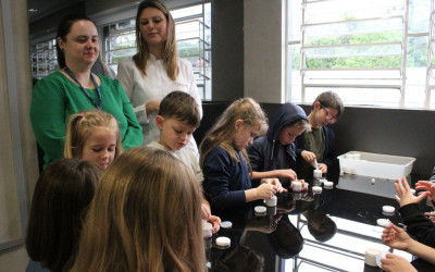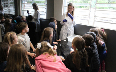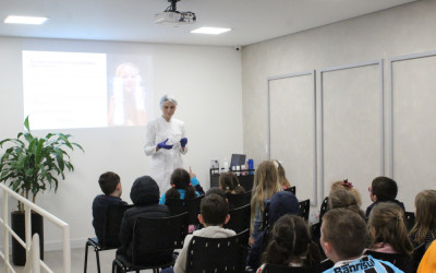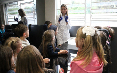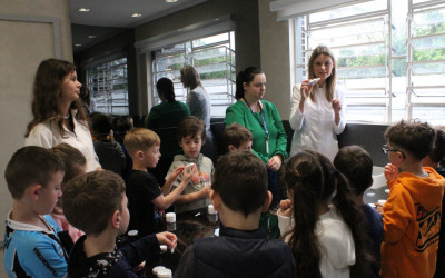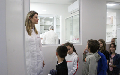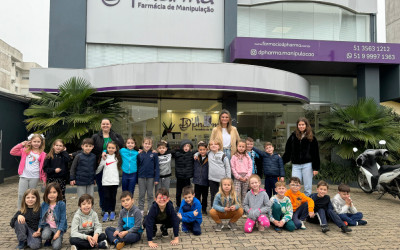 Animados com os resultados das suas pesquisas, os estudantes embarcaram em uma nova aventura na segunda-feira, 9: eles participaram de uma saída pedagógica para a D’Pharma Farmácia de Manipulação. Neste local, o grupo foi recebido pela farmacêutica Scheila Fröhlich, que explicou sobre a composição dos cosméticos, mostrando os riscos do uso de produtos de adultos em crianças e porque não devem ser utilizados.
