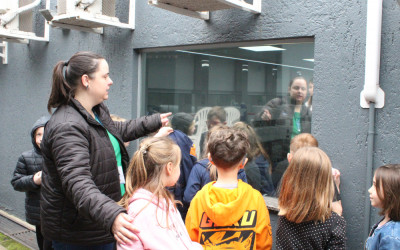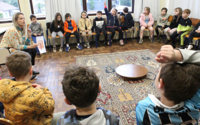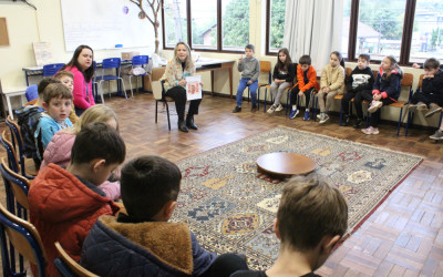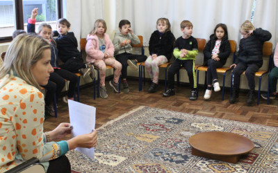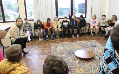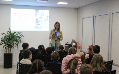 Na quinta-feira, 4, os estudantes receberam a pediatra Yve Lozovei para conversar sobre os desreguladores endócrinos, ou seja, por que as crianças não podem usar os mesmos produtos de higiene que os adultos. Yve trouxe algumas explicações e também respondeu perguntas das crianças.