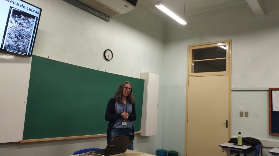 Na última semana antes das férias de julho, quarta-feira, 12, a turma do 1º ano do Itinerário Formativo de Raciocínio Humano e Sustentabilidade recebeu a bióloga do Centro de Educação Ambiental de Ivoti (CEAMI), Tatiane Gutheil.