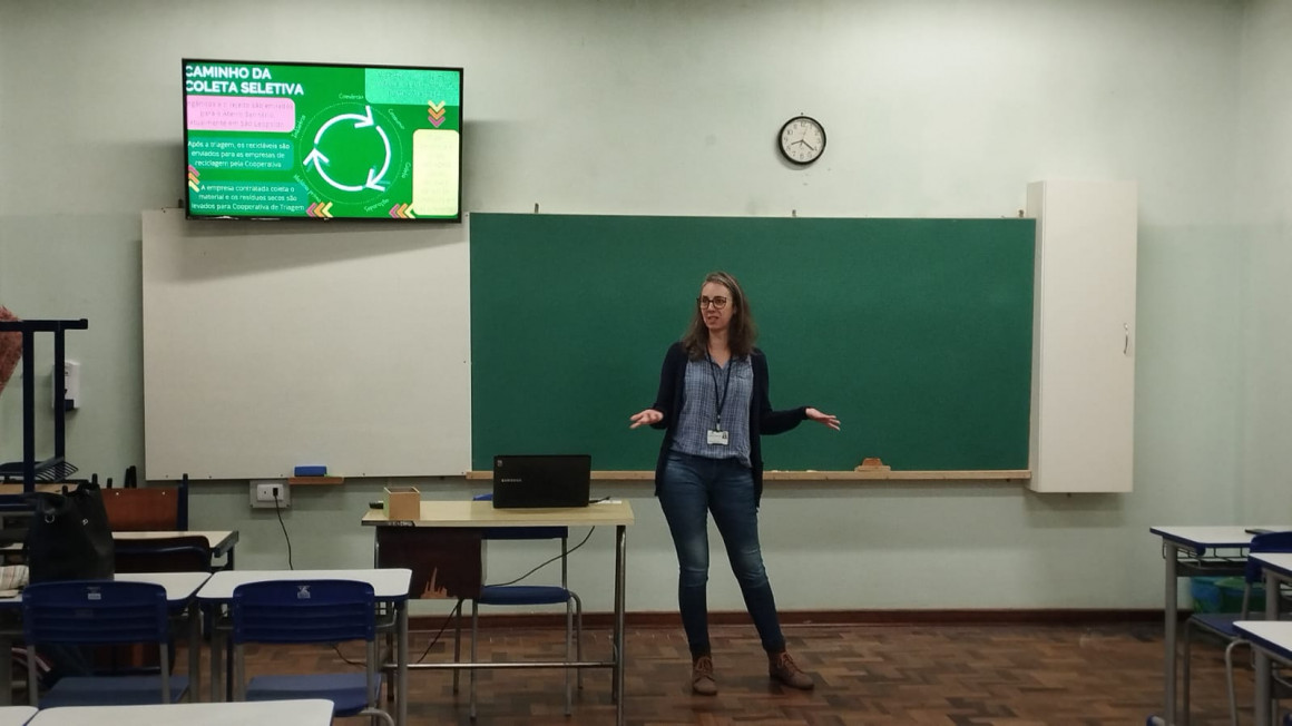 A conversa, coordenada pelos professores Paulo Spolier e Patrícia Fries, girou em torno da gestão de resíduos sólidos em Ivoti e região, abordando aspectos como coleta seletiva, armazenamento e descarte correto de resíduos para evitar contaminação.