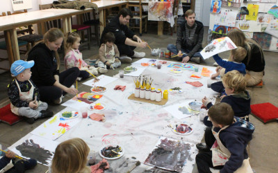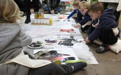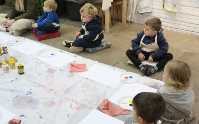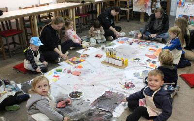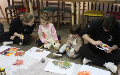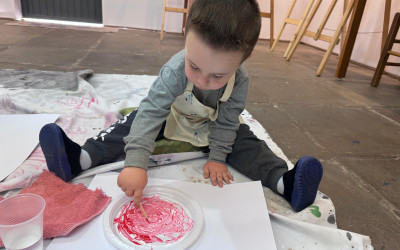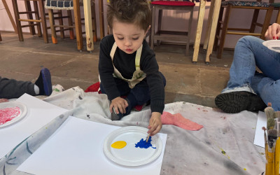 Uma conversa muito interessante sobre diferentes tipos de tinta e pincéis, além de outros materiais necessários para uma pintura encantaram as crianças. Depois dessa conversa cada criança escolheu duas cores de tinta para misturar e fazer uma terceira cor e, claro, mais cores para colorir a própria obra de arte.