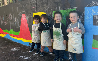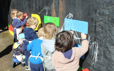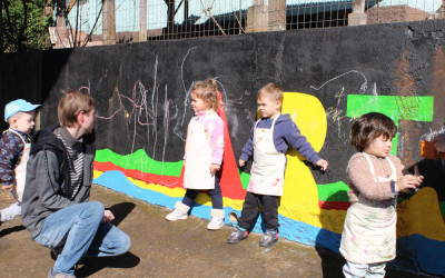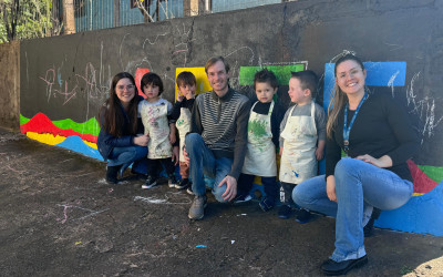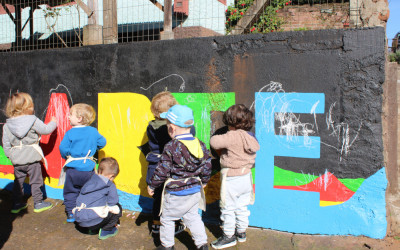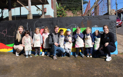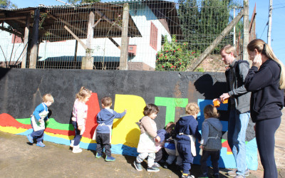 Com os desenhos finalizados, a turma ainda recebeu um convite especial e utilizando giz, coloriu o painel do atelier na área externa.