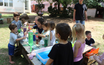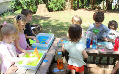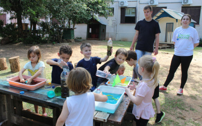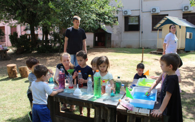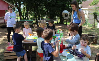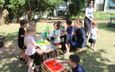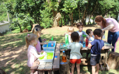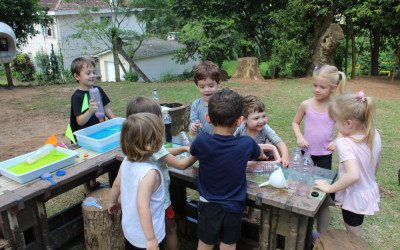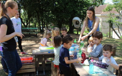A professora Simone Kroetz preparou um espaço especial para a turma: água colorida, peneiras, funil e barquinhos de papel fizeram a alegria das crianças, que puderam explorar esse material junto com as garrafas PET.