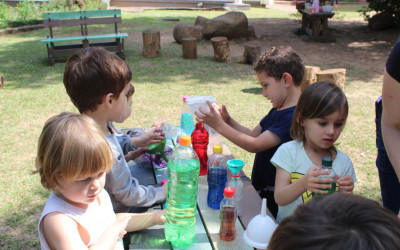 A turma do Nível 3 está realizando diferentes propostas inspiradas no livro A Garrafa, de Patricia Auerbach. Inspiradas na história e aproveitando o calor da última semana, as crianças foram para o pátio brincar com garrafas que continham água colorida.