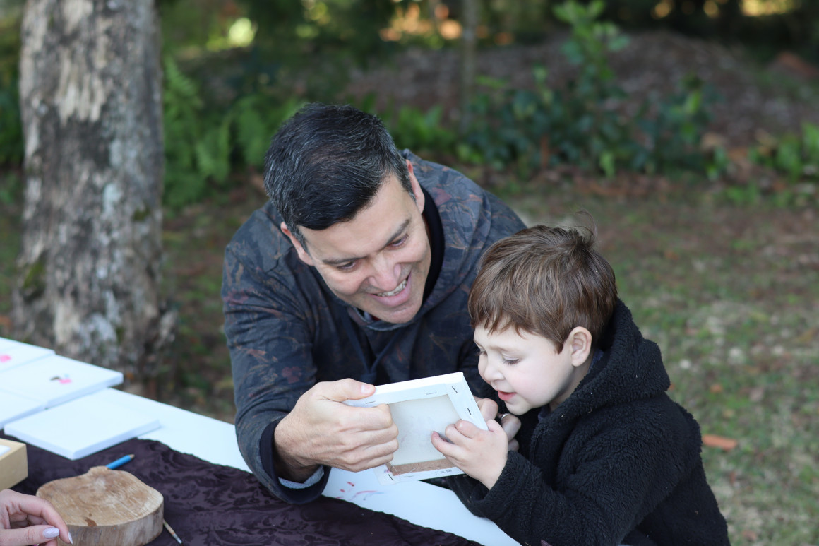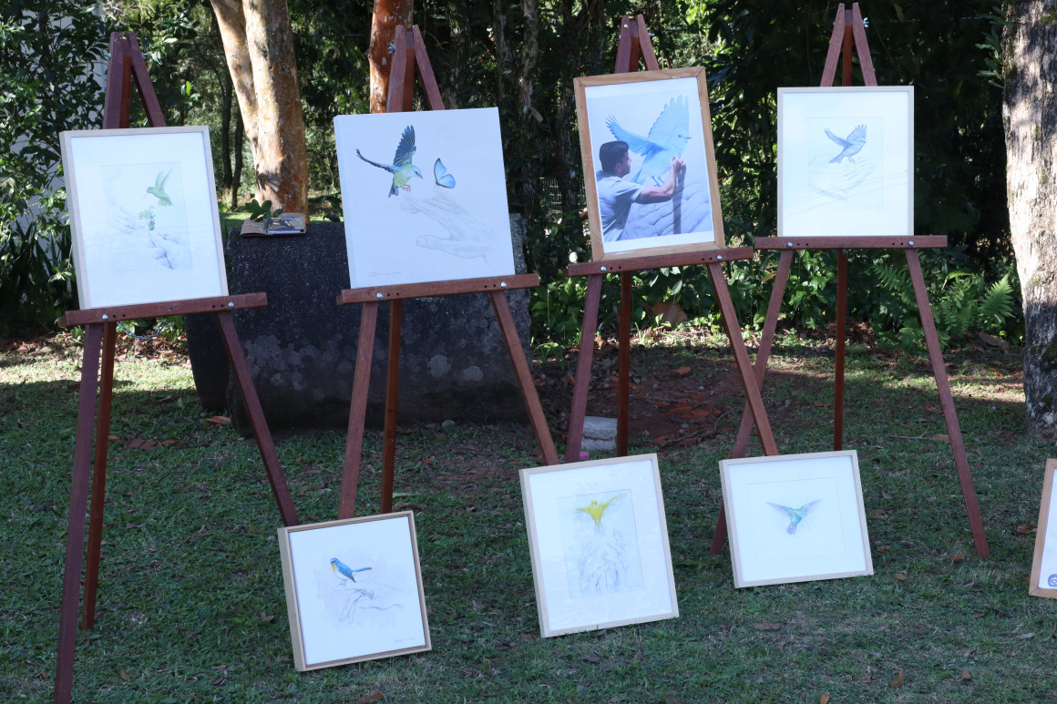 As crianças puderam apreciar de perto algumas das obras do artista, conhecendo as técnicas utilizadas, o processo de criação e a história por trás de diferentes pinturas. A vivência tornou-se ainda mais significativa quando tiveram a oportunidade de colocar a mão na massa: com a orientação de Juliano, exploraram a técnica do grafite e da pintura em aquarela, produzindo seus próprios trabalhos.