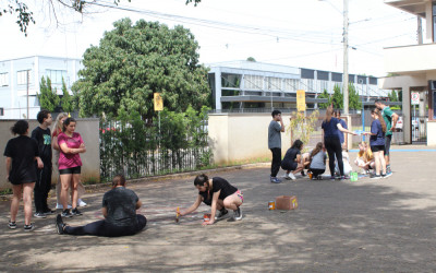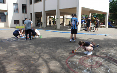 O professor Diego Araujo iniciou uma proposta de revitalização dos espaços utilizados pelas crianças do Ensino Fundamental nos momentos de brincadeiras. Os estudantes do Itinerário Formativo em Formação Docente projetaram diferentes espaços e seguem realizando pinturas no local.