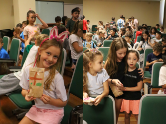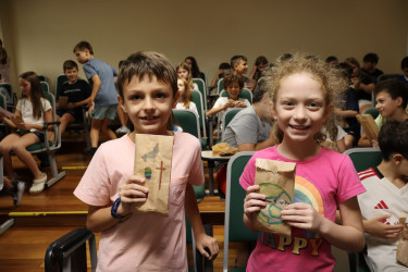 Na sequência, as crianças participaram de um momento de celebração, seguido de confraternização, com lanches trazidos de casa e a partilha de suco de uva. A atividade reforçou valores como cooperação, generosidade e convivência em grupo.