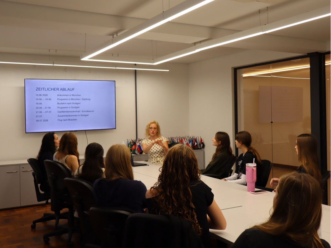 Durante o encontro, as estudantes puderam esclarecer dúvidas, receber orientações e conhecer um pouco mais sobre a organização do intercâmbio. O momento também foi importante para aproximar as participantes da proposta da viagem e preparar o grupo para a experiência cultural e educacional que viverão na Alemanha.